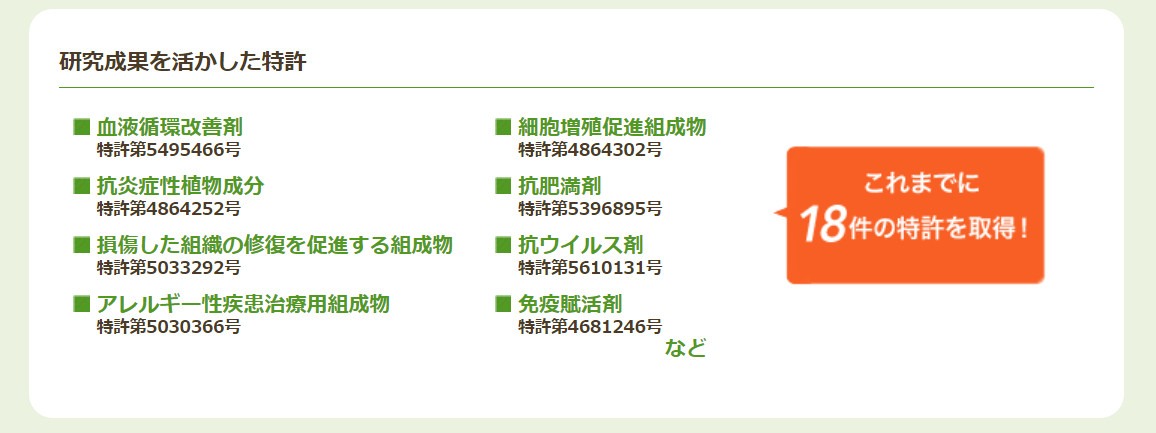 研究成果を活かし、宮古ビデンス・ピローサの特許は18件も取得していて